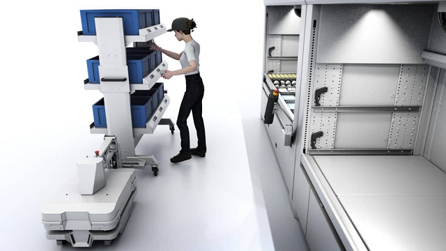 2.批量订单拣货车:拣货车连接到自动移动机器人(AMR),方便多个托盘箱的搬运。